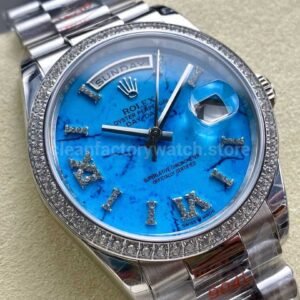8+ Factory Counterweight Rolex Day-Date 128396TBR 36mm Diamond Bezel Full Platinum Roman Numerals Ice Blue Dial
