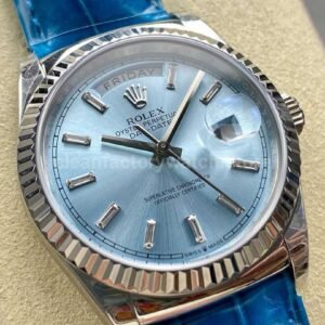 8+ Factory counterweight Rolex Day-Date 36mm 128236-0009 White Gold Crocodile Leather Strap Baguette Diamond Ice Blue Dial