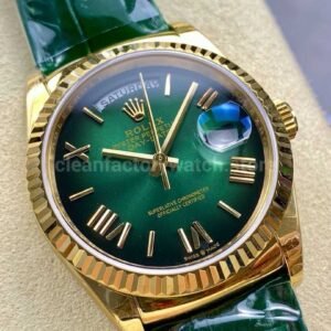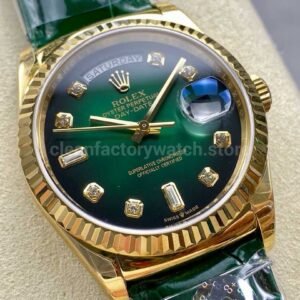 8+ Factory counterweight Rolex Day-Date 36mm 128238-0069 Yellow Gold Crocodile Leather Strap Diamond Mope Baguette Diamond Green Ombré Dial