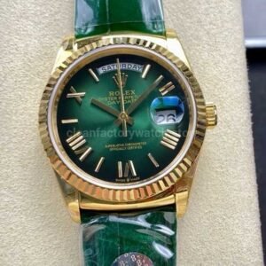 8+ Factory counterweight Rolex Day-Date 36mm 128238-0118 Yellow Gold Crocodile Leather Strap Roman Numerals Green Ombré Dial