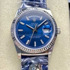 8+ Factory counterweight Rolex Day-Date 36mm 128239-0069 White Gold Crocodile Leather Strap Baguette Diamond Blue Dial