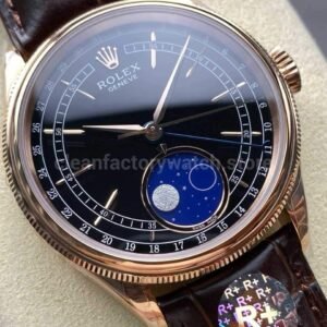 R+ Factory Counterweight Rolex Cellini Moonphase 50535 39mm Rose Gold Brown Leather Strap Black Dial