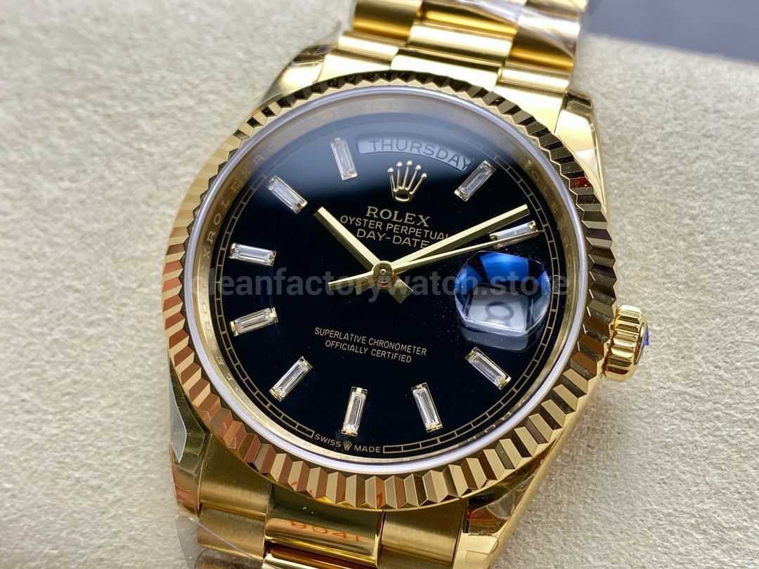 8+ Factory Counterweight’ Rolex Day-Date 128238 36mm Full Yellow Gold Baguette Diamond Black Dial