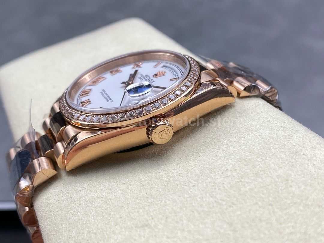 8+ Factory Counterweight Rolex Day-Date 128345RBR-0054 36mm Diamond Bezel Full Rose Gold Roman Numerals White Dial