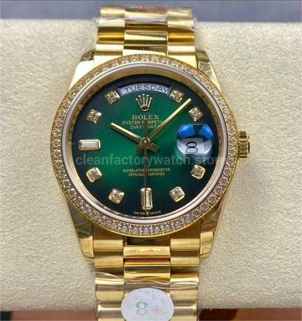 8+ Factory Counterweight Rolex Day-Date 128348RBR-0035 36mm Diamond Bezel Full Yellow Gold Diamond Mope Baguette Diamond Green Dial