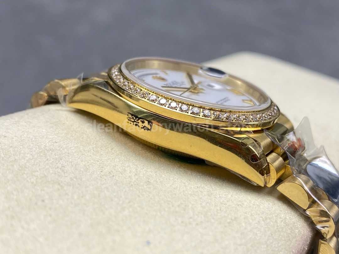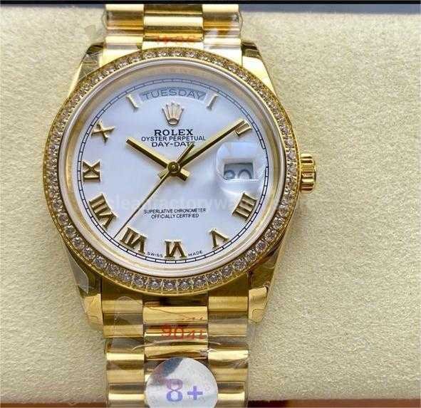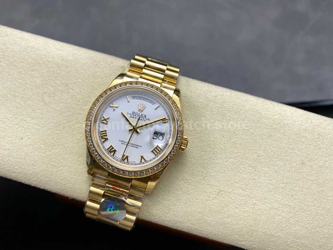 8+ Factory Counterweight Rolex Day-Date 128348RBR-0042 36mm Diamond Bezel Full Yellow Gold Roman Numerals White Dial