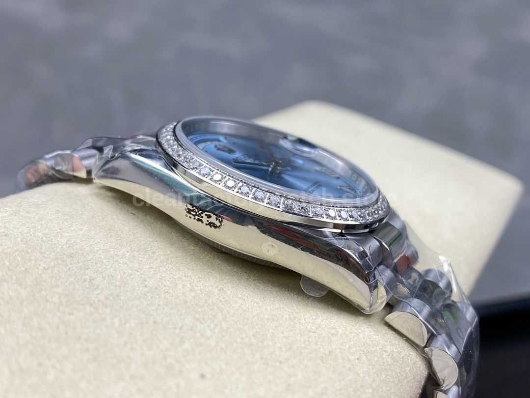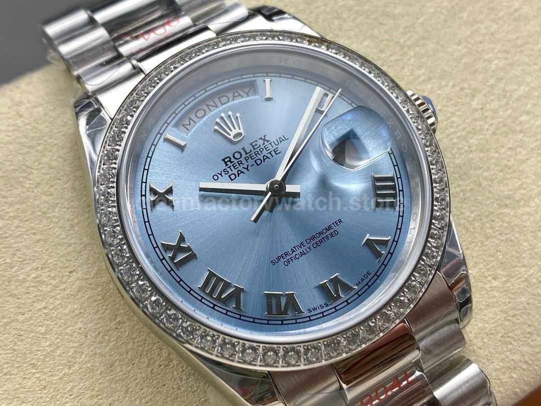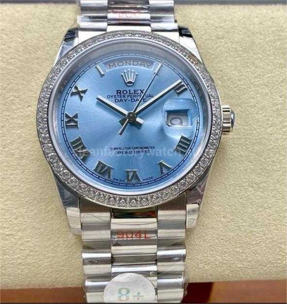 8+ Factory Counterweight Rolex Day-Date 128396TBR 36mm Diamond Bezel Full Platinum Roman Numerals Ice Blue Dial