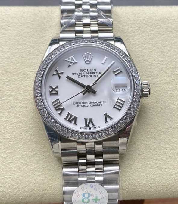 8+ Factory Rolex counterweight Datejust 278384RBR-0014 31mm Diamond White Gold Bezel Full 904L Roman Numerals White Dial Jubilee