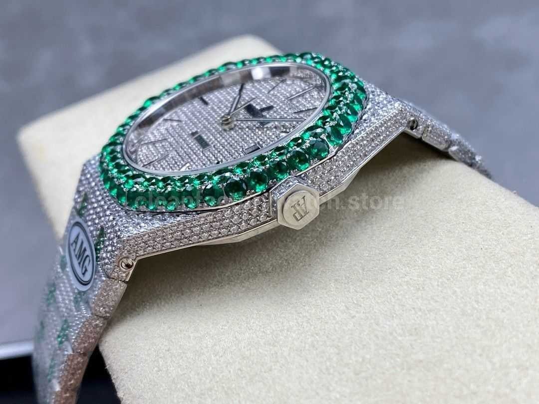 A truly exceptional watch is not only about aesthetics but also about the movement within. The AMG 15400 Full Diamond is powered by a 9015 movement modified to resemble the CAL.3120, ensuring accurate timekeeping and robust power reserve, all while maintaining a slim profile for enhanced wearing comfort.