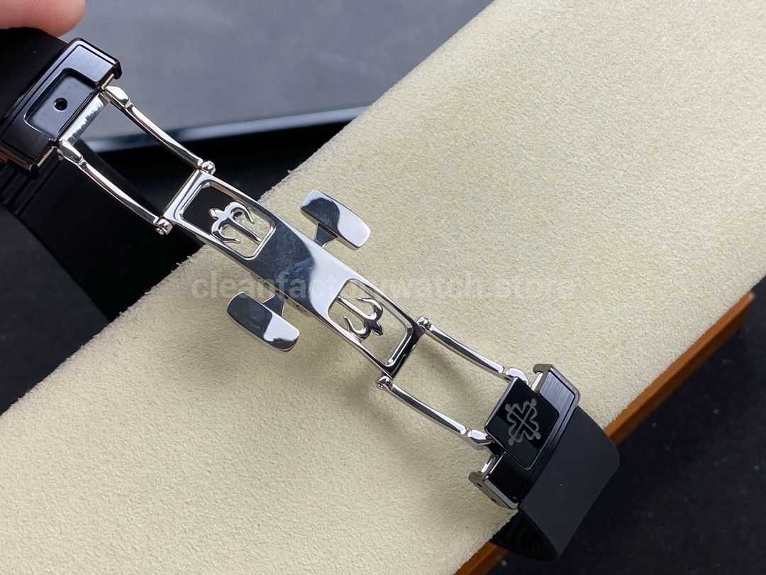 Fitted with a Patek Philippe-style ceramic clasp, showcasing a clean, embossed logo. Elegant, durable, and built to last.