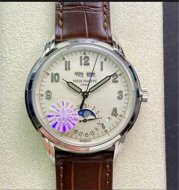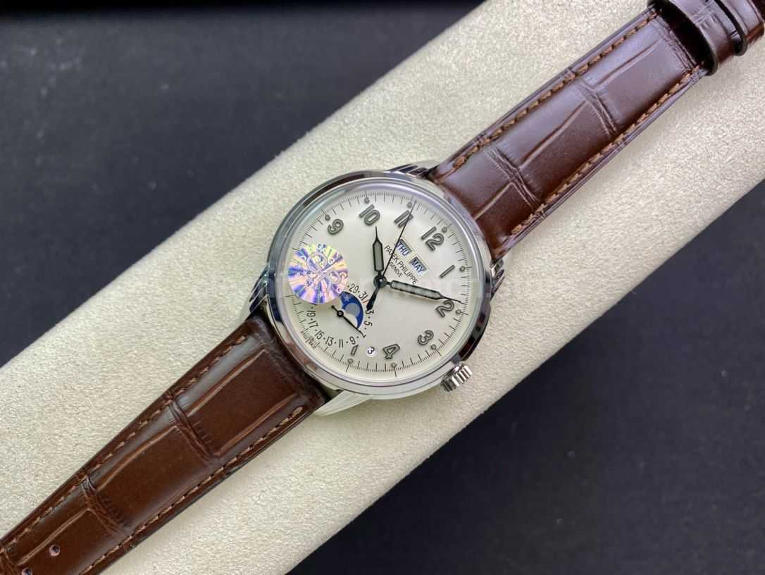 Powered by a high-end replica of the Patek Philippe 324 S Q self-winding movement, this watch is a finely tuned version of the legendary Caliber 324. The bridges are chamfered and polished with exquisite detail. The main plate is adorned with perlage, while the bridges feature Geneva stripes and gold engravings. Even screw slots and jewel holes are hand-polished and beveled.