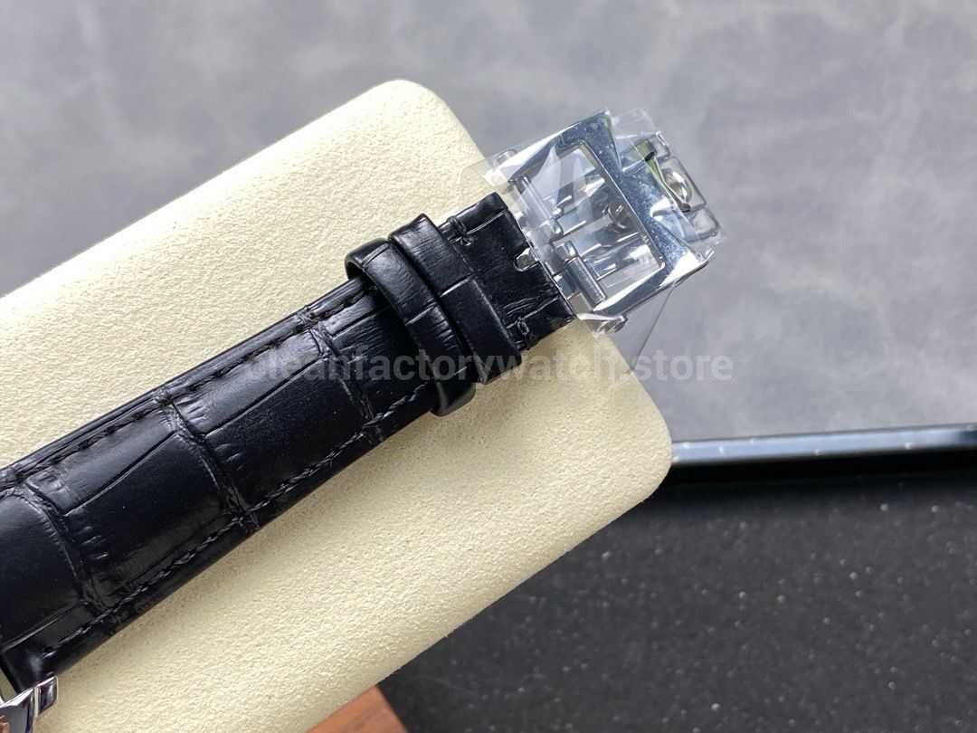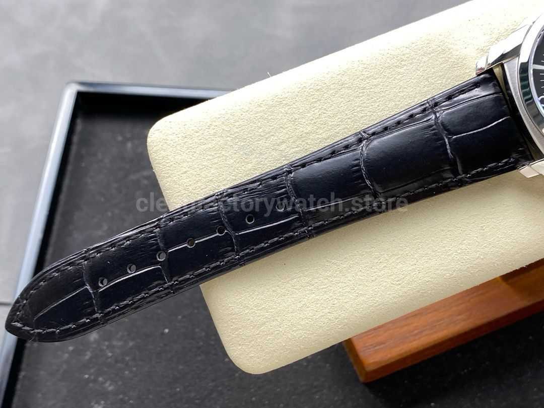 Powered by a modified 9015 automatic movement upgraded to the 5100/1 spec, offering a thinner profile with a high beat rate of 28,800 vibrations per hour. The central triangular date indicator mirrors the official design, combining practical utility with aesthetic appeal.