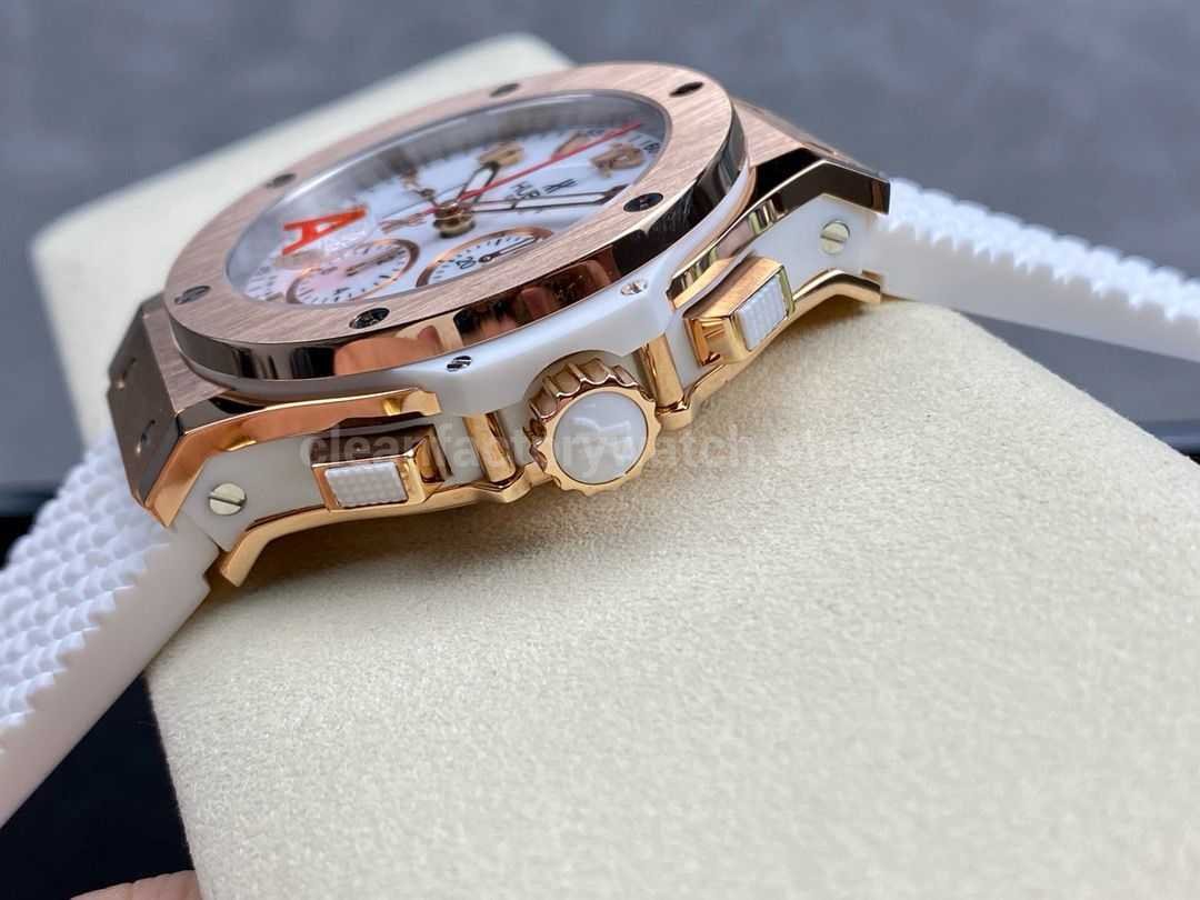 The rose gold case contrasts sharply with the white resin inserts, complemented by rose gold screws and luminous hour markers—faithfully capturing the design language of the original model.