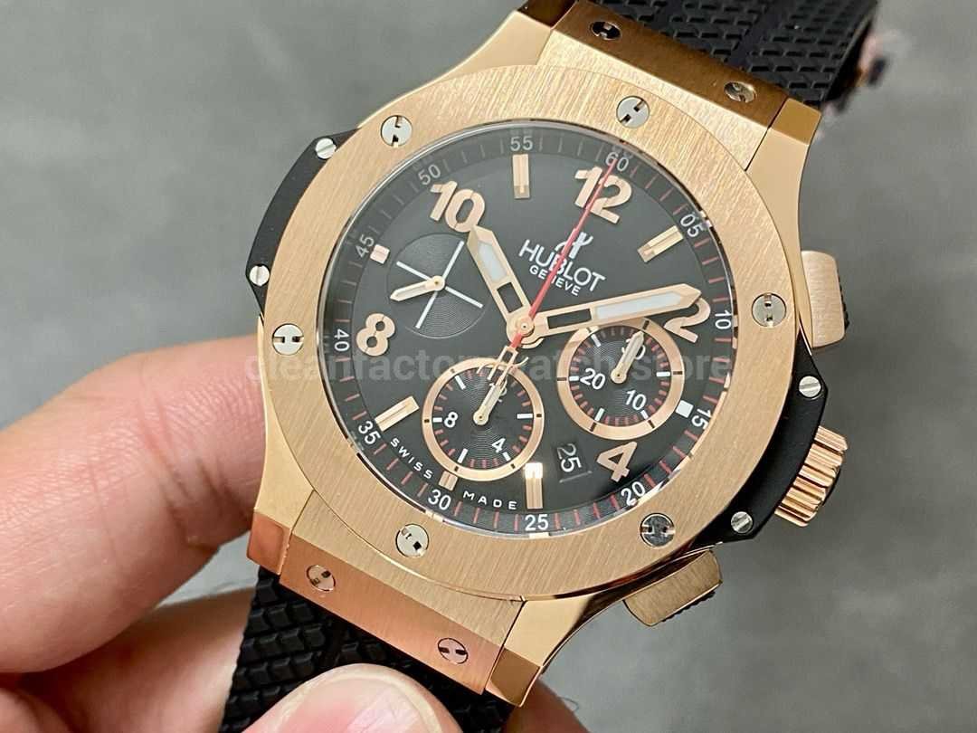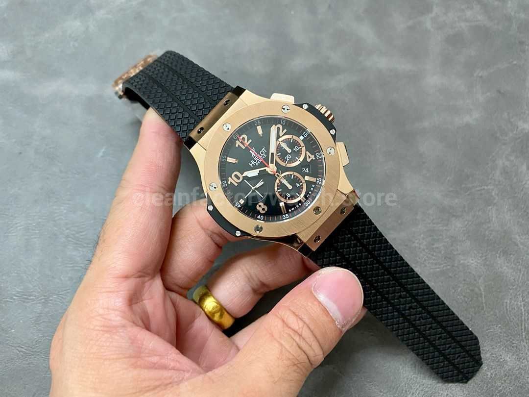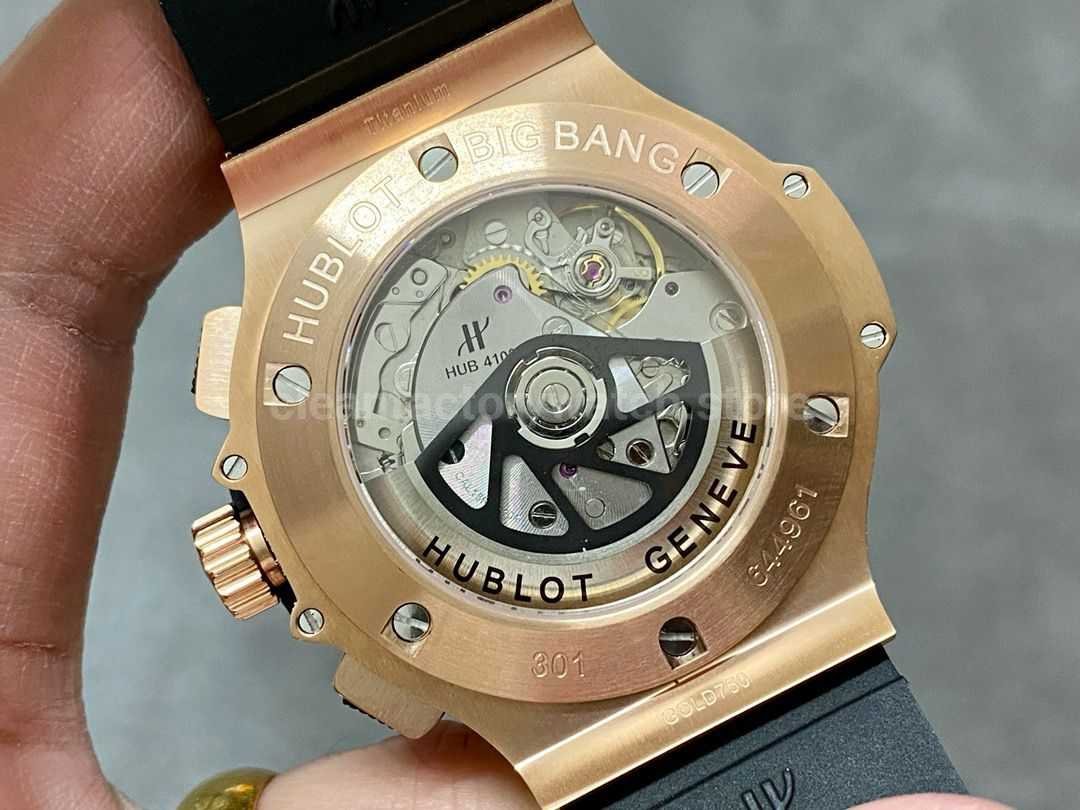 Can also be upgraded to a clone HUB4100 movement version, featuring “HUB4100” engraving and Geneva stripe decoration on the bridges, offering a more authentic look through the transparent case back.