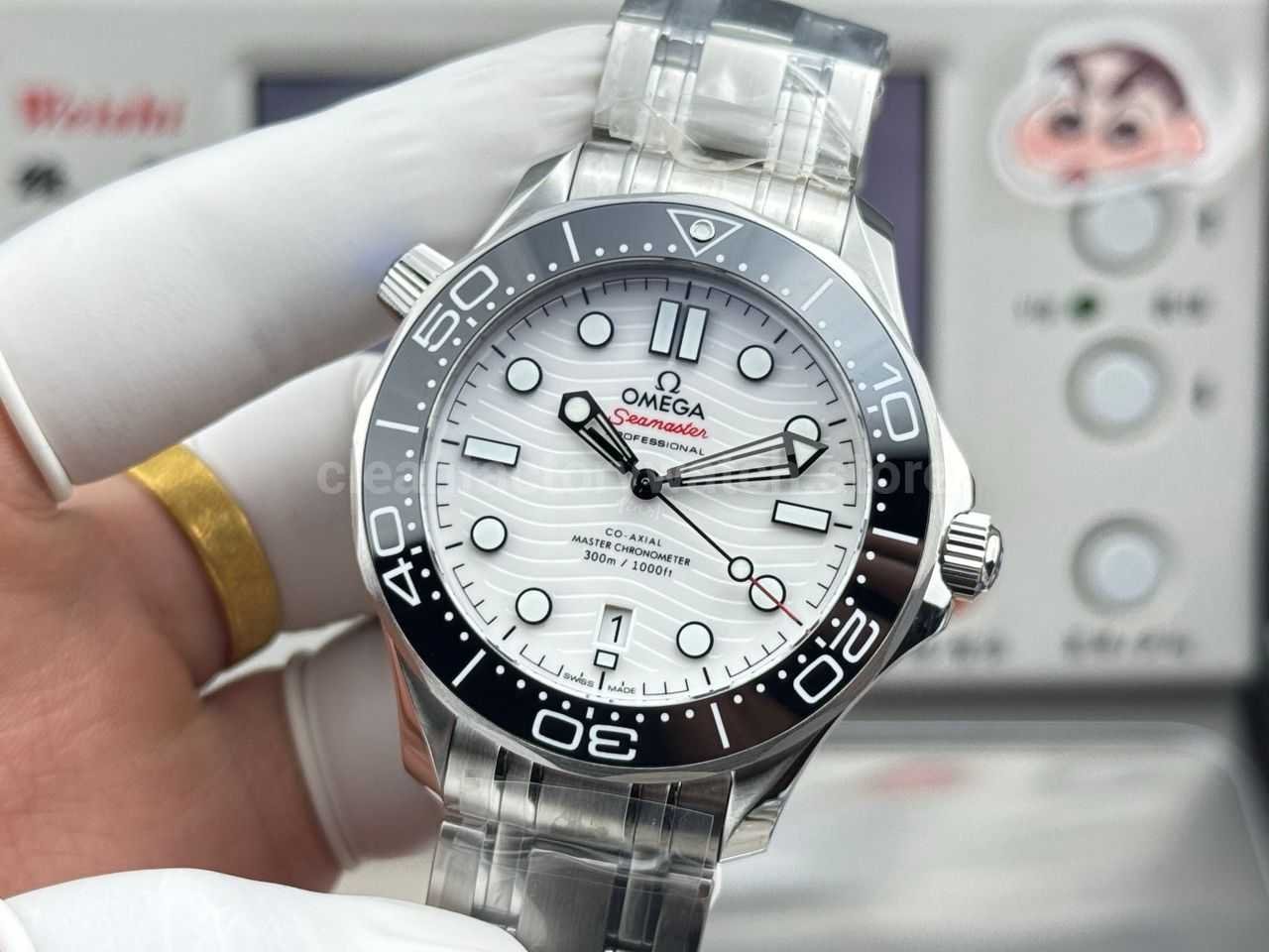 The dial is also constructed from polished ceramic, enhanced with laser-engraved wave patterns, delivering depth, clarity, and light reflection that closely mirror the genuine Omega Seamaster 300M.