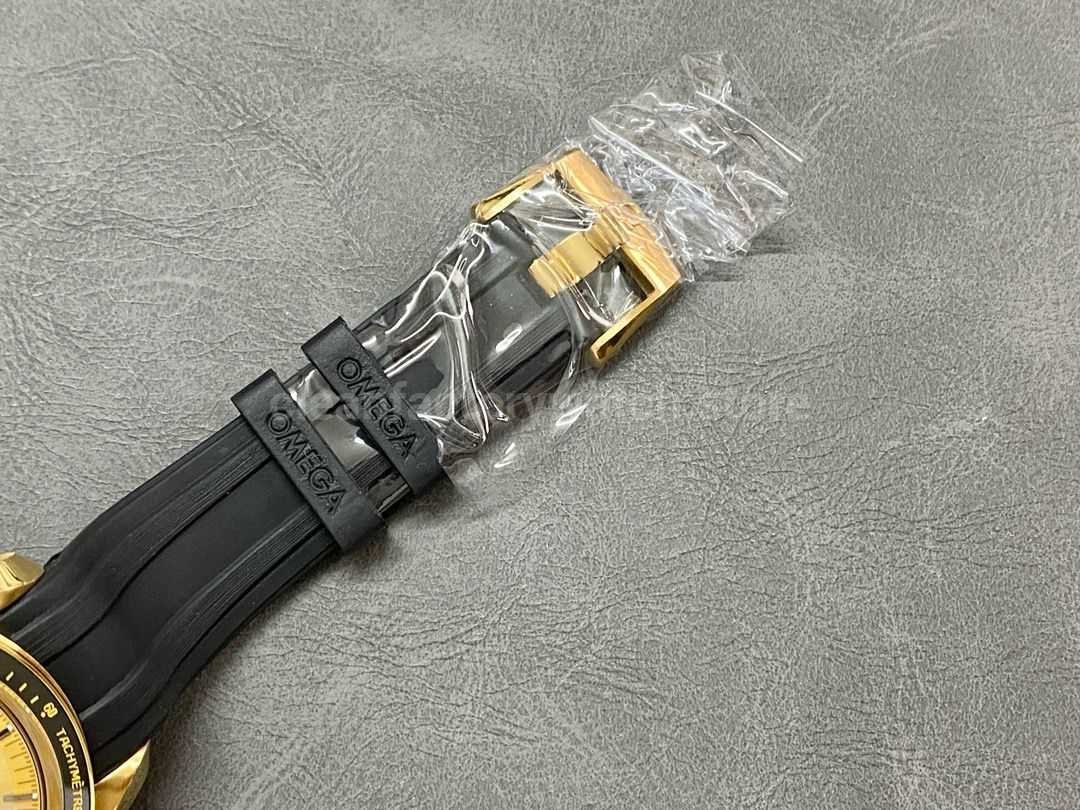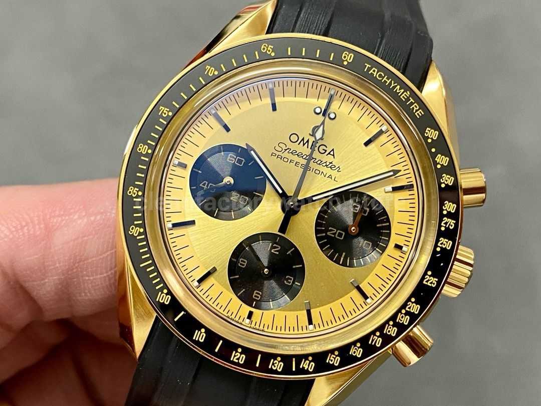The ceramic bezel is adorned with OMEGA’s patented Ceragold tachymeter scale, known for its scratch resistance and long-lasting finish. A standout detail is the “Dot Over Ninety” (DON) marking above the “90” on the bezel – a perfect replica of early Speedmaster models, sure to stir nostalgia among seasoned watch enthusiasts.