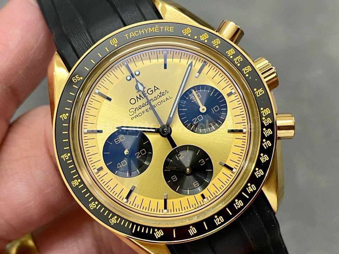 The entire watch is electroplated with Moonshine 18K gold, presenting a warm and understated golden hue that radiates subtle luxury. Its 42mm asymmetrical case, inspired by the fourth-generation Speedmaster Moonwatch, is meticulously finished with both polished and brushed techniques, creating a dynamic play of light and metal. The crown features an embossed OMEGA logo, and the chronograph pushers are crafted from the same material, providing a strong sense of unity and showcasing exquisite craftsmanship.