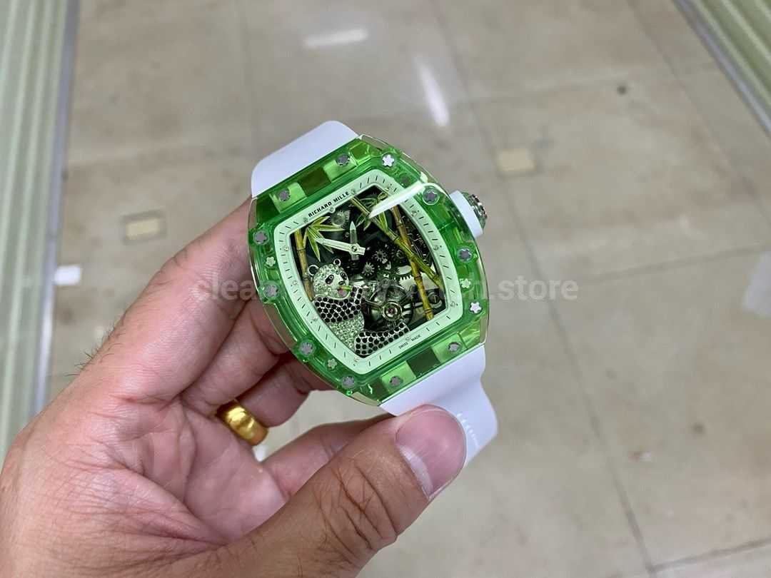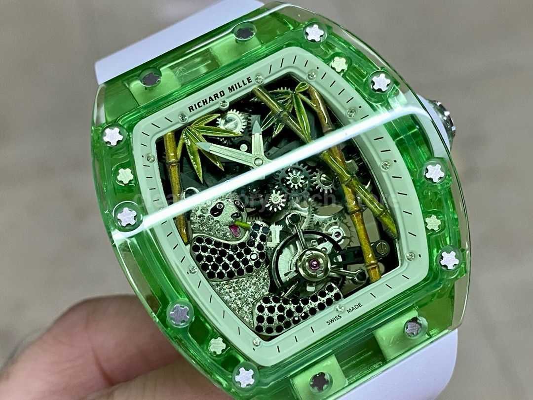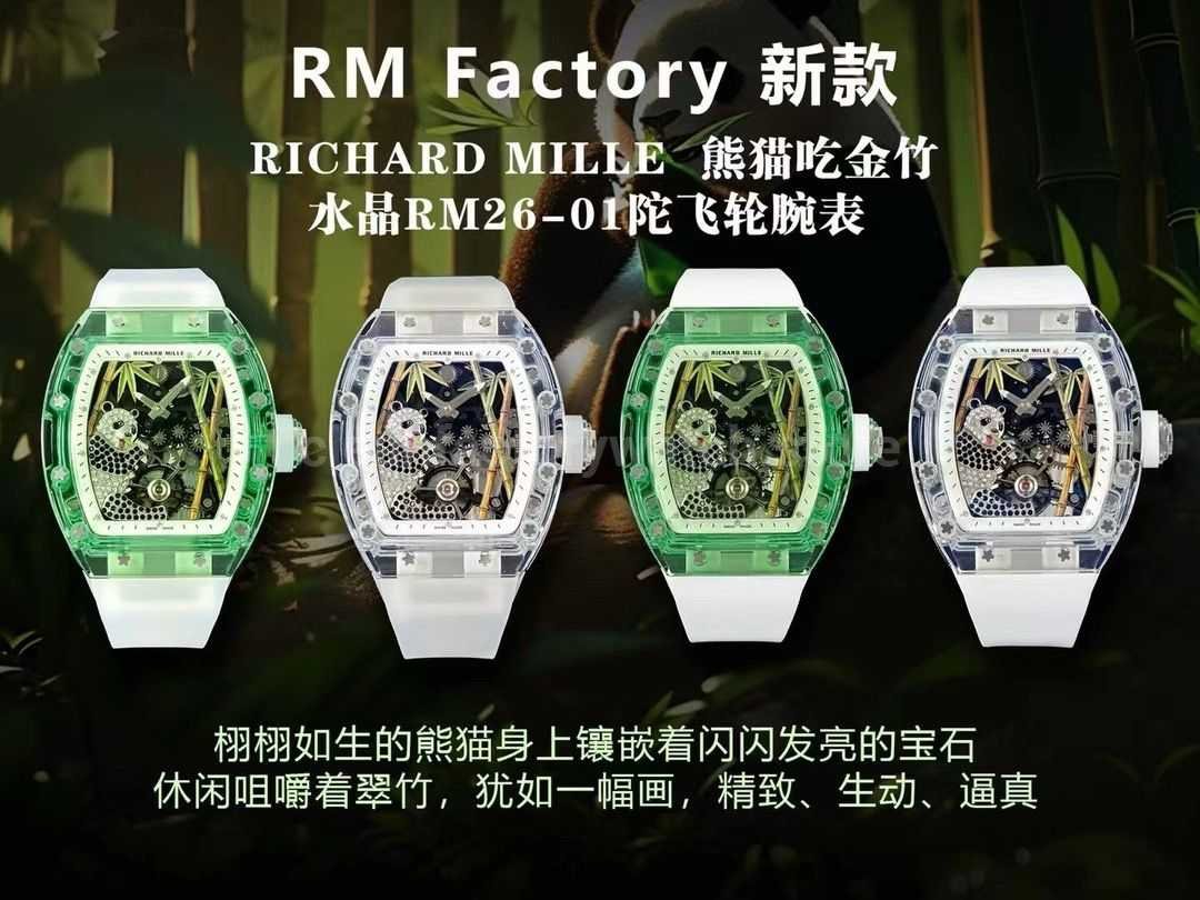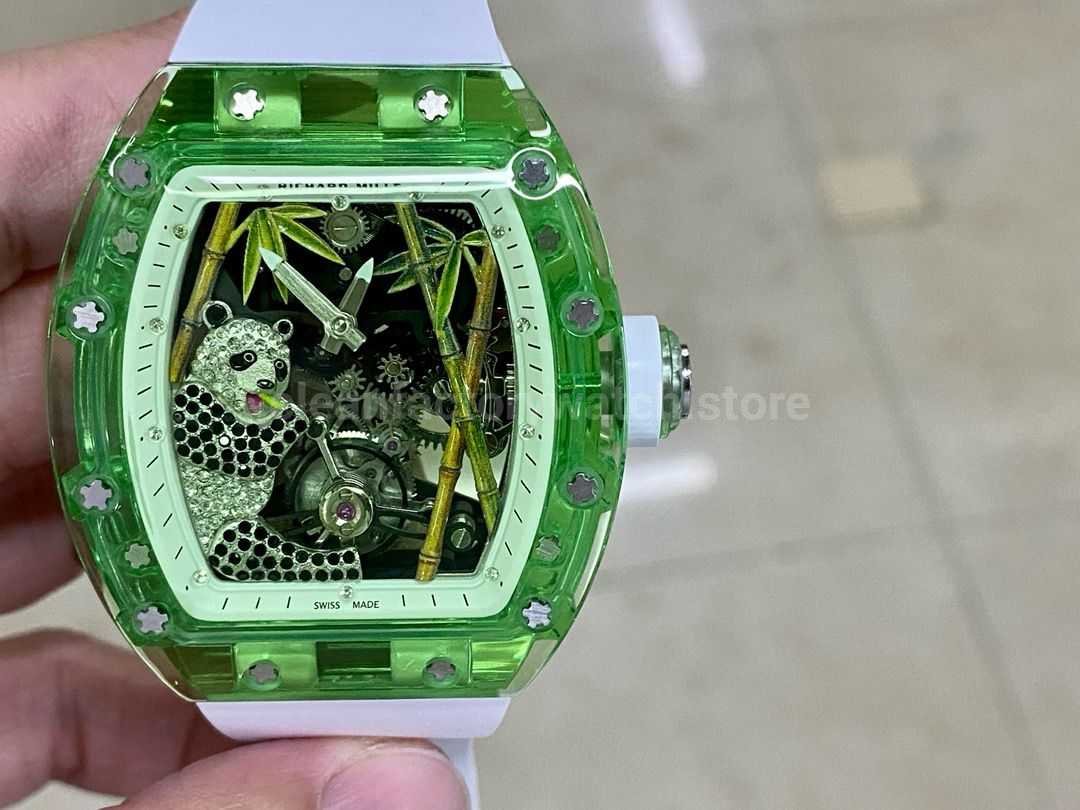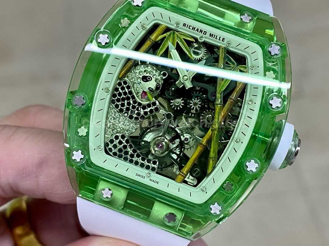 The RM26-01 perfectly combines haute horology craftsmanship with exquisite artistry. At the center of the dial, a lifelike three-dimensional panda is meticulously sculpted, its body adorned with sparkling gemstones. The panda leisurely chews on vivid green bamboo leaves, resembling a miniature three-dimensional painting—delicate, vivid, and lifelike—showcasing the brand’s distinctive artistic aesthetic.