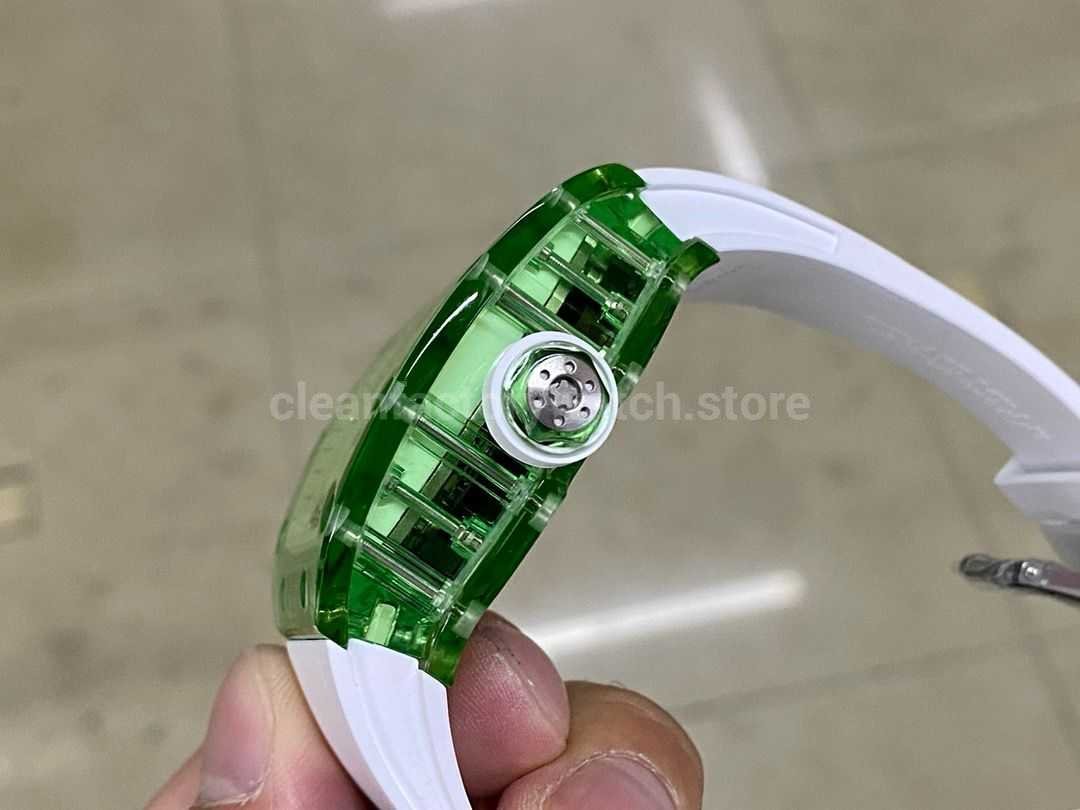 • Material Composition: The bezel, case middle, and caseback are crafted from clear, transparent crystal, secured with titanium screws.