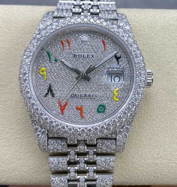 This customized Rolex Datejust features a fully paved case and bracelet with high-quality moissanite diamonds, offering brilliance comparable to natural diamonds and showcasing the lavish aesthetic of Middle Eastern style.